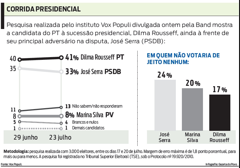 Pesquisa do instituto Vox Populi, para a TV Bandeirantes e o "site" IG, divulgada ontem à noite, aponta a candidata petista Dilma Rousseff liderando a disputa presidencial, com a preferência de 41% dos eleitores brasileiros. Em segundo lugar está José Serra (PSDB), com 33% das intenções de votos. Em terceiro, Marina Silva (PV), com 8%. Os outros candidatos juntos somam 1%. Nulos e brancos são 4%, e 13% dos eleitores não souberam ou não quiseram responder. Na simulação entre um eventual segundo turno entre Dilma e Serra, a petista mantém a vantagem de 8 pontos porcentuais sobre o tucano: 46% contra 38%. De acordo com a pesquisa, Serra possui a maior rejeição: 24% afirmaram que não votariam nele. Marina vem em seguida, com 20% e, por último, Dilma, com 17%. Na pesquisa espontânea, quando os nomes dos candidatos não são apresentados ao entrevistado, Dilma alcança 28%, Serra 21% e Marina 4%. O presidente Lula, que não concorre, tem 4% e o candidato apoiado por ele 1%.