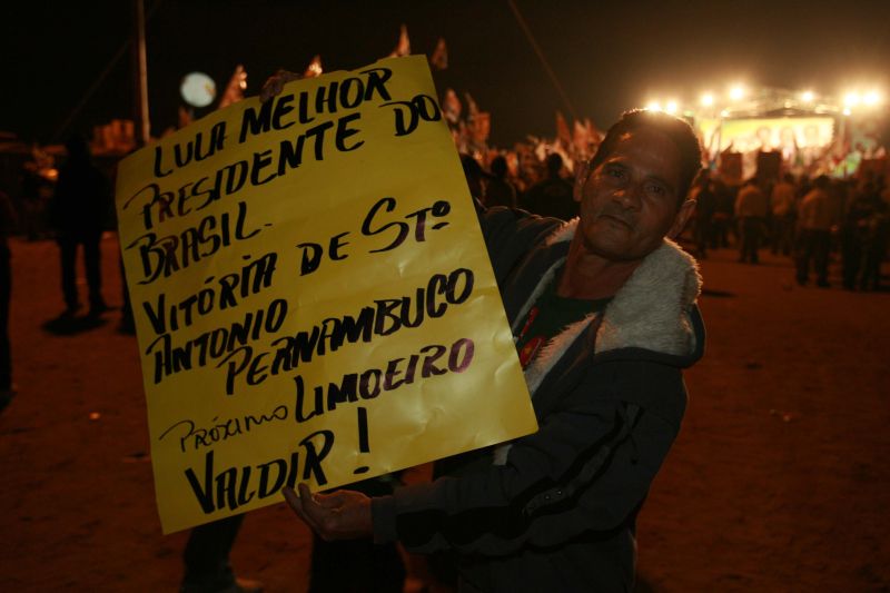 No comício, ele segurava um cartaz: "Lula melhor presidente do Brasil. Vitória de Sto Antônio. Pernambuco. Próx a Limoeiro." Imaginava que poderia chegar perto do palco e mostrar a cartolina a Lula, na esperança de que o presidente o chamasse para conversar ao ver que se tratava de um nordestino como ele. Não deu. Mas isso não abala a confiança que o presidente inspira nele. "Vou votar na Dilma porque assim tô votando no Lula."