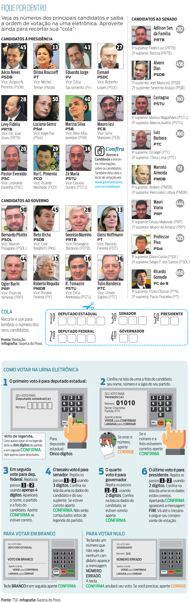O eleitor que ainda tiver dúvidas quanto a candidatos ou aos seus respectivos números pode consultar a relação ao lado com as informações sobre os concorrentes aos principais cargos. Além disso, é possível acessar o perfil dos mais de mil candidatos do Paraná disponíveis no Candibook. A recomendação do TSE é que os eleitores levem consigo ao local de votação uma "cola", como a disponível abaixo, com os números dos candidatos. A cola da Gazeta também está disponível para impressão no Candibook, bem como os endereços de votação. A votação será realizada das 8h às 17h. O eleitor precisa levar o título eleitoral e um documento oficial com foto.