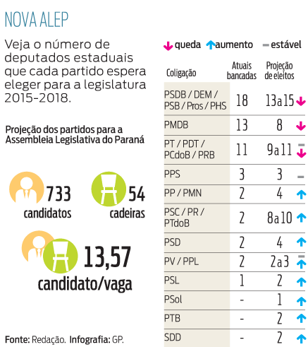 A eleição de hoje deve confirmar o PSC, de Ratinho Jr., como principal força da Assembleia Legislativa do Paraná para o período 2015-2018. Dono de 358 mil votos para deputado federal em 2010, ele tende a ser o principal puxador de votos do partido, que calcula conquistar até 10 cadeiras na Casa. Por outro lado, o PMDB, que hoje é a maior bancada, deve ver o seu número de vagas minguar. No melhor dos cenários, o total de peemedebistas deve cair de 13 para 8.