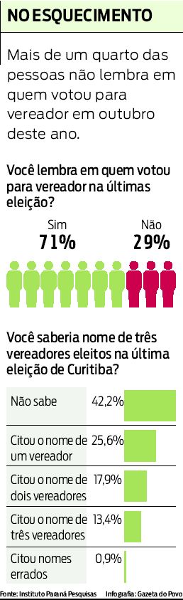Mais de um quarto dos eleitores de Curitiba não lembra em quem votou na última eleição para vereador, apesar de o pleito ter ocorrido há menos de três meses. Levantamento do Instituto Paraná Pesquisas mostra que 28,5% dos eleitores esqueceu o nome do candidato em que votou para a Câmara Municipal. O porcentual da população que lembra em quem votou é de 70,8%. Para especialistas, é alto o grau de esquecimento dos eleitores, o que revela que uma parcela da população não tem interesse na escolha de representantes para o Legislativo.