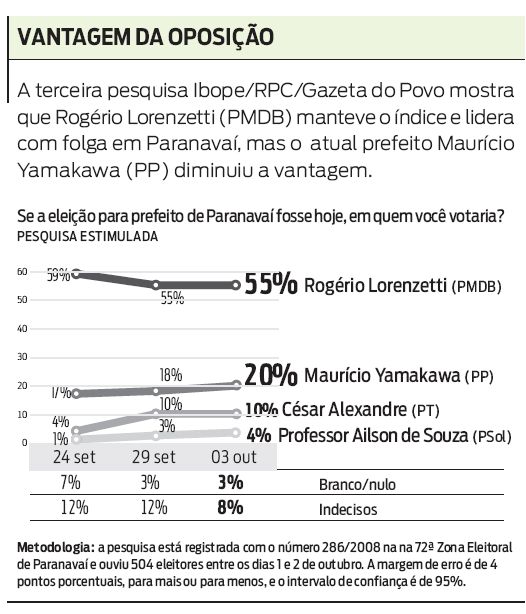 Na terceira rodada da pesquisa Ibope/RPC/Gazeta do Povo em Paranavaí, o candidato da oposição Rogério Lorenzetti (PMDB) obteve o mesmo índice da segunda consulta. Ele está com 55% das intenções de votos contra 20% de Maurício Yamakawa (PP), que tenta se reeleger e subiu dois pontos porcentuais.