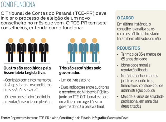 O processo de eleição só será definido no início da próxima semana. "Na segunda-feira vou ver como proceder. Preciso conversar com a assessoria jurídica da Casa antes de decidir como será o processo. Não podemos cometer erros e a pressa é inimiga da perfeição", comentou o presidente da Alep. Apesar de qualquer cidadão poder se inscrever para a vaga, é provável que a disputa fique entre dois deputados estaduais: Fabio Camargo (PTB) ou Plauto Miró (DEM). Os sete conselheiros do TCE são responsáveis por analisar as contas de todas as prefeituras e dos órgãos do governo do estado anualmente, além de fiscalizar a prestações de contas de entidades que recebam recursos públicos.