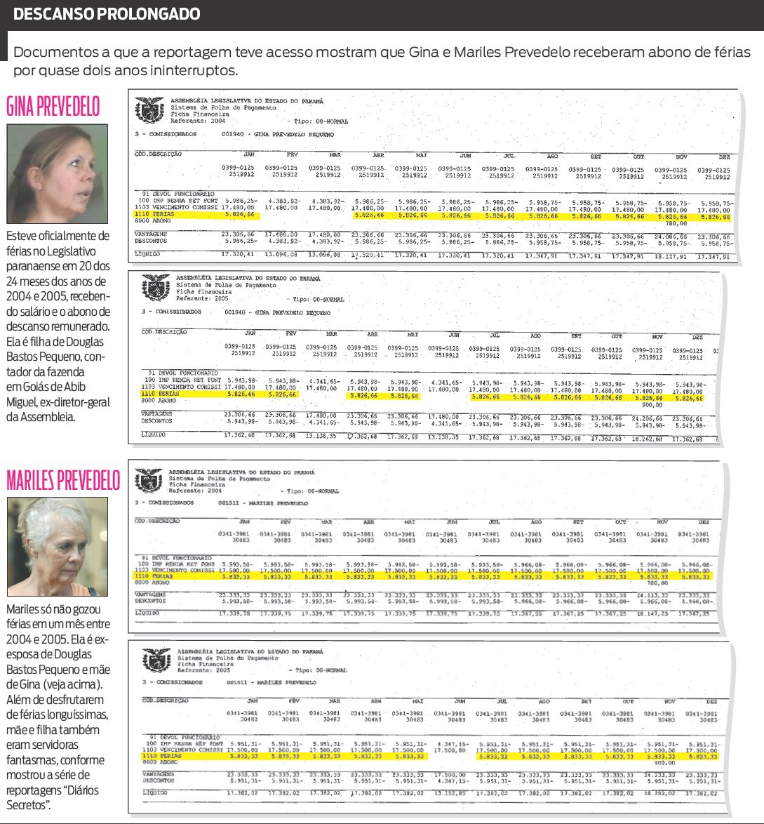 Duas funcionárias comissionadas da Assembleia Legislativa do Paraná (AL) tiraram férias remuneradas por quase dois anos ininterruptos, entre 2004 e 2005. Documentos obtidos com exclusividade pela Gazeta do Povo e pela RPCTV revelam que a Assembleia pagou R$ 5,8 mil por mês, referentes ao abono de férias, para Mariles Prevedelo e para a filha dela, Gina Prevedelo Pequeno. Ao todo as duas receberam R$ 250 mil só de abono nos anos de 2004 e 2005.