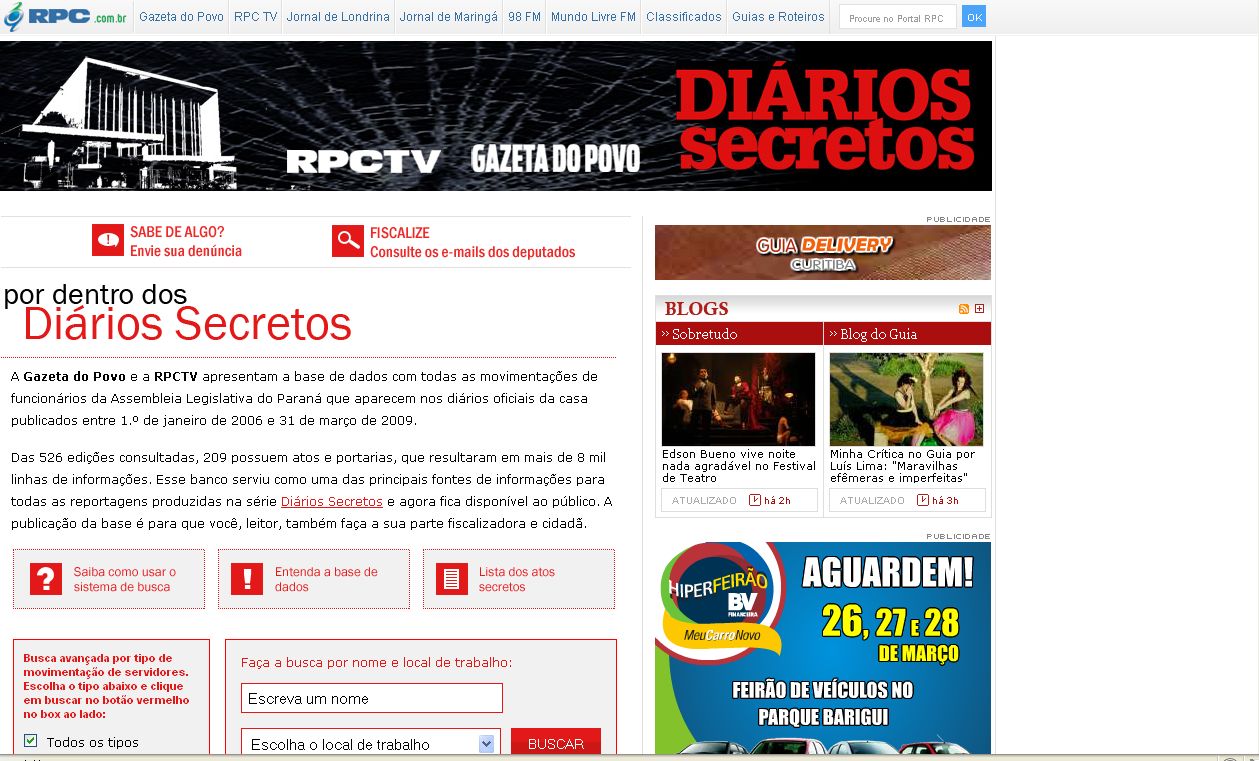 A equipe de repórteres da Gazeta do Povo e da RPCTV teve acesso a exatos 724 diários oficiais da Assembleia Legislativa do Paraná, publicados entre 1998 e 2009. Para possibilitar o cruzamento de informações, os jornalistas digitaram em uma planilha todas as movimentações de funcionários. Parte desta planilha, referente aos últimos quatro anos de pesquisa, se transformou no site "Por dentro dos diários secretos" que compreende um grande sistema de busca que possibilitará ao leitor verificar os dados dos diários analisados. (Leia o tutorial para tirar dúvidas sobre a navegação).