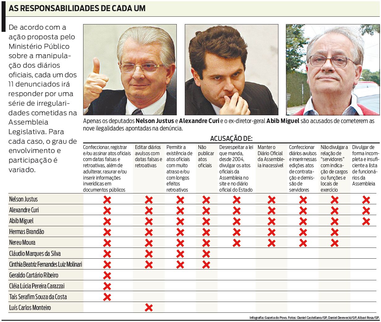 Quase um ano após o escândalo dos Diários Secretos da Assembleia Legislativa do Paraná (Alep) ter vindo à tona, o Ministério Público Estadual (MP) protocolou ontem na Justiça uma ação de improbidade administrativa contra 11 pessoas envolvidas em 9 irregularidades na Casa. Dentre elas, estão três deputados estaduais (Nelson Justus, DEM; Alexandre Curi, PMDB; e Nereu Moura, PMDB) e dois ex-parlamentares da Casa (Hermas Brandão e Geraldo Cartário). Hermas e Justus são ex-presidentes da Casa.
