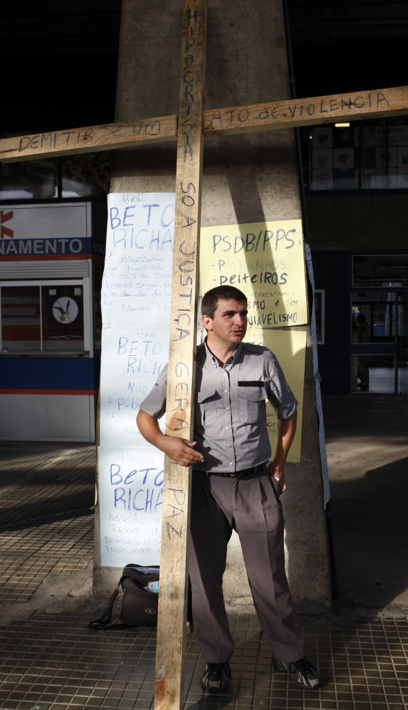 Revoltado com sua demissão da Urbs, o ex-agente de trânsito Aparecido Massaranduba, de 36 anos, caminhou ontem cerca de 20 quilômetros entre Campina Grande do Sul e Curitiba carregando uma cruz de três metros de altura. Ao chegar na sede da Urbs, dentro da Rodoferroviária, ele iniciou uma greve de fome. "Só estou tomando água", disse.