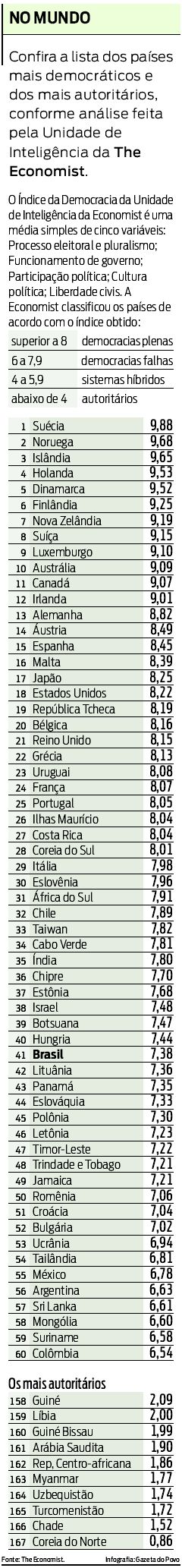 Segundo a pesquisa, embora não tenha sido detectada uma tendência de retração da democracia, há pouca percepção de que houve uma melhora nos últimos anos. O Brasil, por exemplo, manteve a mesma nota de quando o estudo foi realizado pela primeira vez 7,38. Em 2006, porém, o Estado brasileiro ocupava a 42ª posição. Agora, o país ocupa a 41ª (leia mais na página 20).