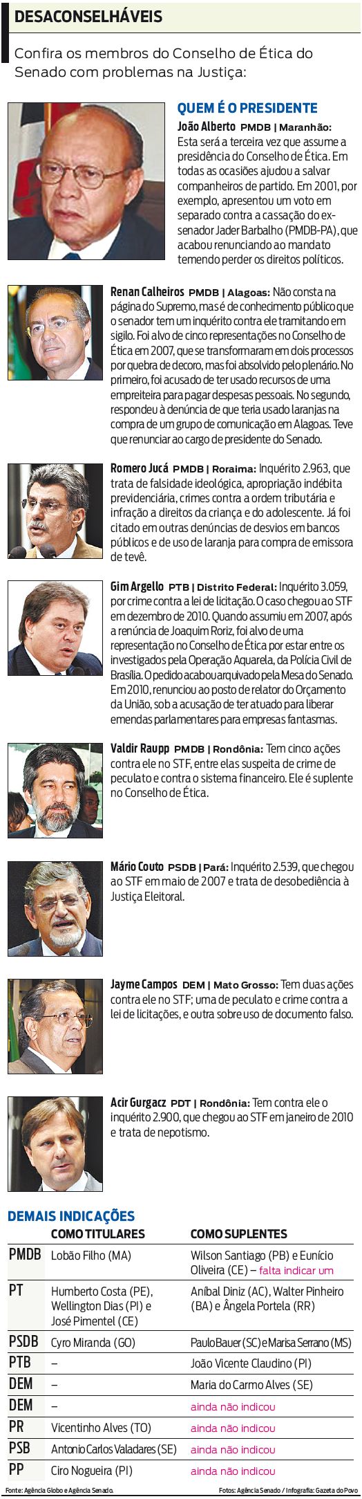 Com 7 dos 30 integrantes envolvidos em processos no Supremo Tribunal Federal (STF), o Conselho de Ética e Decoro Parlamentar do Senado começou a trabalhar ontem com a eleição de um presidente conhecido por ajudar a "engavetar" denúncias polêmicas. Colega de partido e aliado maranhense de José Sarney (PMDB-AP), o senador João Alberto ocupa o cargo pela terceira vez. Ele foi escolhido, em votação secreta, com 14 votos houve um voto em branco.