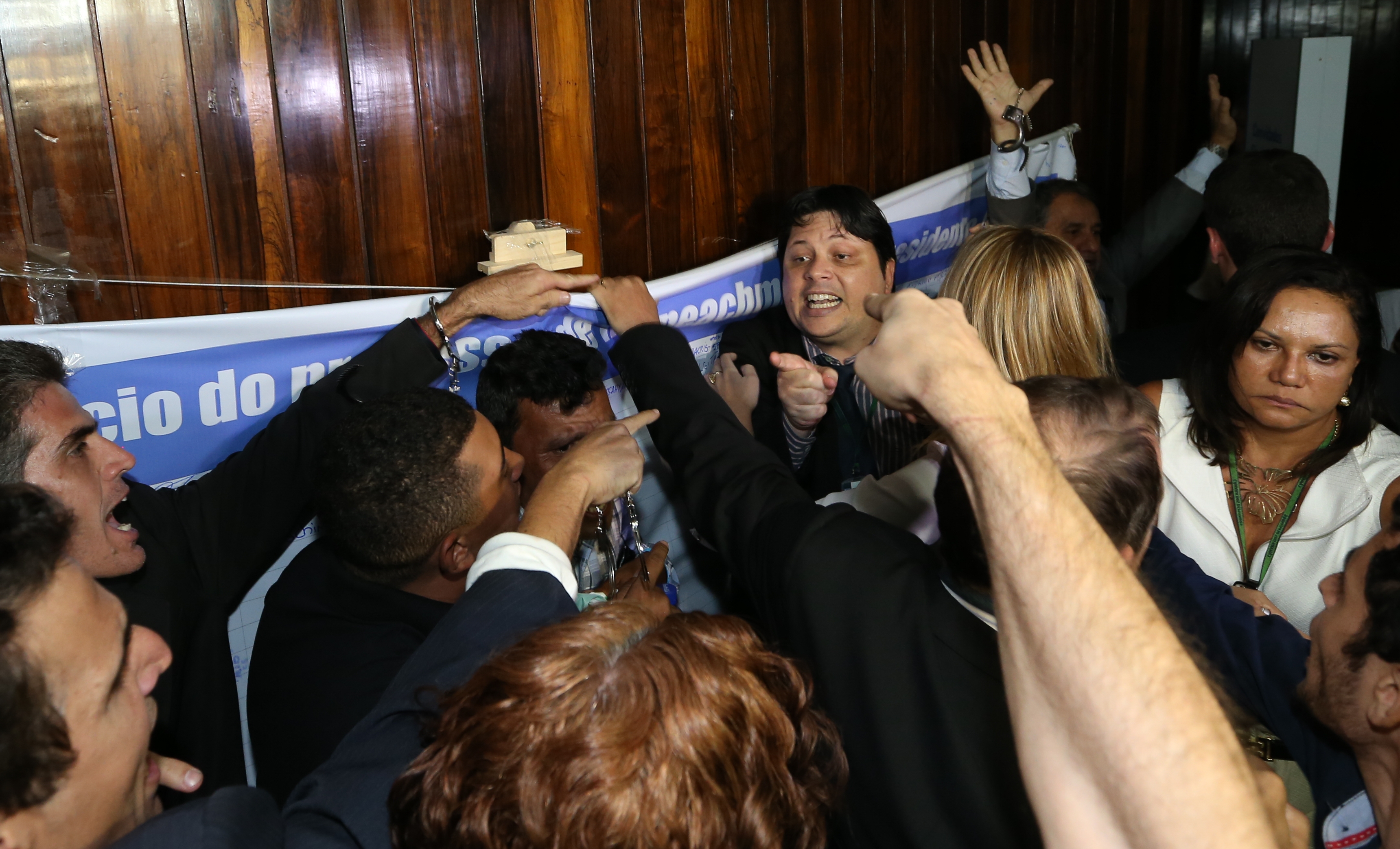 Um painel pró-impeachment da presidente Dilma Rousseff instalado pela oposição no Salão Verde da Câmara dos Deputados nesta quarta-feira, 4, provocou confusão entre representantes de movimentos que defendem o afastamento da petista, funcionários da Câmara e deputados petistas. A confusão terminou com um funcionário da liderança do PT detido e denúncias de agressões física e verbal.
