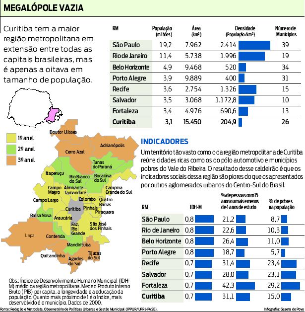 "Temos de enfrentar o egoísmo de cada gestor. As diferenças são muito grandes e geram problemas imensos de gestão pública. Araucária tem sete vezes a arrecadação de Fazenda. Dá para imaginar?", provoca Wandscheer. O enfrentamento também é assunto nas academias. O geógrafo Francisco Mendonça, da UFPR, figura entre os entusiastas da tática, a qual considera de urgência-urgentíssima. O modelo de gestão municipalista, afirma, repousa em algum lugar do século 19. "Está fadado ao fracasso", declara, chamando atenção para o que está debaixo dos narizes: Curitiba, Colombo, Campo Largo, São José dos Pinhais e Piraquara formam uma única mancha urbana. Há pelo menos uma dezena de áreas em comum.