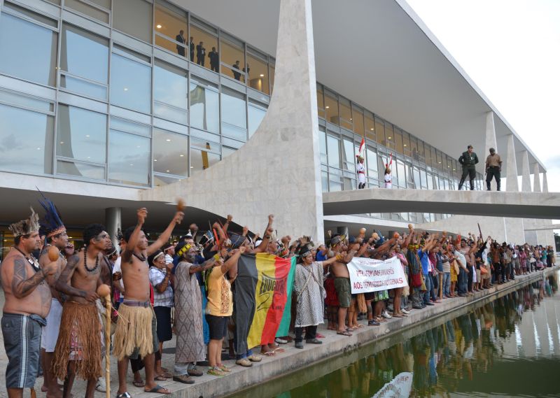 Um grupo de 400 índios invadiu ontem a área externa do Palácio do Planalto aos gritos de "Dilma assassina". Representantes de várias etnias, eles insistiam em marcar uma audiência com a presidente Dilma Rousseff, que embarcou ontem para Lima, no Peru. "Não vamos invadir o palácio, mas só saímos daqui depois que nos passarem data do encontro com a presidente. Ela nunca nos recebeu", disse Neguinho Trocá.