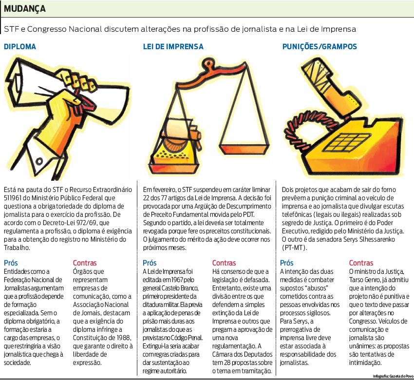 Alterações em leis criadas durante a ditadura militar para regulamentar um dos pilares de qualquer democracia devem movimentar Brasília nos próximos meses. Após quatro décadas de omissão, os três poderes agem para mudar a Lei de Imprensa e as regras da profissão de jornalista. O debate é longo e complexo envolve tanto propostas de liberalização quanto de punições mais duras por eventuais abusos cometidos por profissionais e veículos de comunicação.