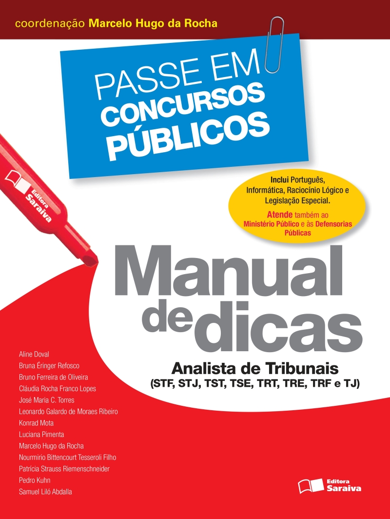Um apanhado de questões comentadas para os candidatos a vagas de analistas de tribunais está disponível na obra Manual de Dicas, da coleção Passe em Concursos Públicos. As questões foram extraídas de provas realizadas por diversas bancas examinadoras, como FGV e Cespe e têm conteúdo voltado para quem tem interesse em atuar nos seguintes tribunais: STF, STJ, TST, TSE, TREs, TRFs e TJs.
