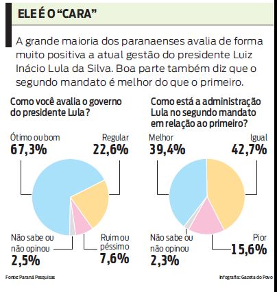 Levantamento de opinião feito pelo Instituto Paraná Pesquisas, a pedido da Gazeta do Povo, revela que 67,3% dos eleitores paranaenses consideram o governo Lula ótimo ou bom; 22,6% acham que é regular e 7,6%, ruim ou péssimo.