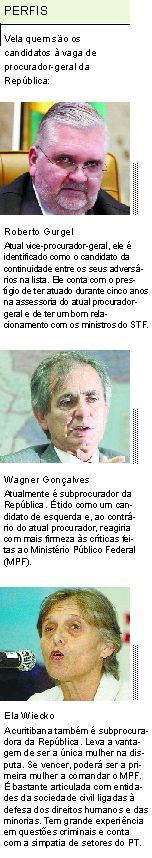 Lula deve escolher o próximo procurador-geral da República e o Senado deve aprová-lo até o dia 26 de junho, data em que o atual ocupante deixa a função, depois de quatro anos no cargo. A lista tríplice é formada pelo vice-procurador-geral da República, Roberto Monteiro Gurgel; o coordenador da área criminal do MPF, Wagner Gonçalves, e a subprocuradora federal dos Direitos do Cidadão, Ella Wiecko.