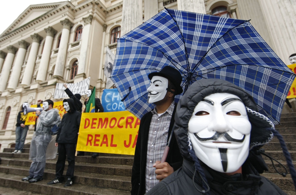 Um grupo de 80 pessoas, boa parte usando máscaras, protestou ontem no Centro Cívico de Curitiba. Os manifestantes, na maioria estudantes entre 16 e 20 anos, saíram debaixo de chuva da Praça Santos Andrade, com cartazes criticando a "falta de democracia" no país. Em frente ao Palácio Iguaçu, eles cantaram o Hino Nacional. As máscaras usadas eram do personagem do filme V de Vingança, que retrata a saga de um anarquista vivendo em meio a sociedade totalitária.
