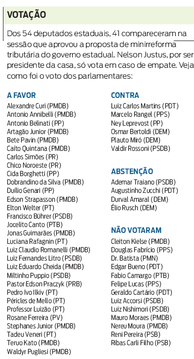 A oposição tentou adiar a votação com requerimento que foi recusado. "Primeiro teríamos que fazer a votação da Reforma Tributária Nacional, que está no Congresso, para discutir uma reforma aqui", disse o deputado Elio Rusch (DEM), líder da oposição. "Não é momento para se discutir aumento de impostos", completou.