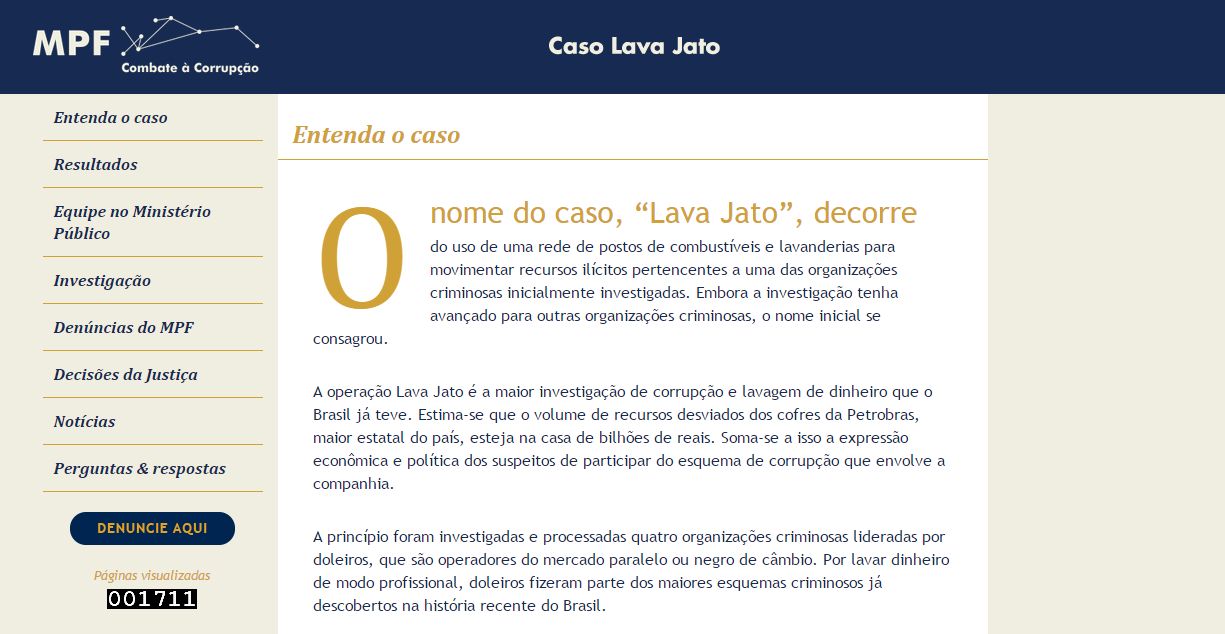 O site compila ainda os principais resultados, em números, da Lava Jato até agora. Os crimes já denunciados envolvem cerca de R$ 2,1 bilhões, sendo que R$ 450 milhões já são considerados recuperados e R$ 200 milhões foram bloqueados em bens. Os números consideram atualizações até dezembro. Segundo a Procuradoria, foram apresentadas 18 acusações criminais realizadas pelo órgão até o momento, contra 86 pessoas, pelos crimes de corrupção, crime contra o sistema financeiro nacional, tráfico transnacional de drogas, formação de organização criminosa, lavagem de ativos, entre outros. São 150 pessoas e 232 empresas sob investigação. No total, 12 acordos de colaboração premiada - a exemplo do que fez o doleiro Alberto Youssef - foram feitos com pessoas físicas.