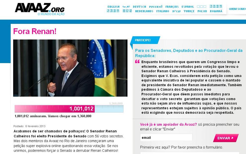 A iniciativa foi catalizada pela organização não-governamental Avaaz. Os cidadãos podem assinar a petição pela internet, informando nome, endereço de e-mail, cidade e telefone. Além da cassação de Renan, o abaixo-assinado pede ainda que a Câmara dos Deputados e o procurador-geral da República acabem com o voto secreto e que "garantam que votações como esta não sejam alvo de influências sujas".
