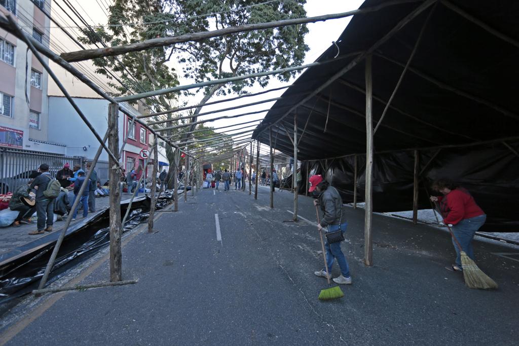 Durante todo dia desta quarta-feira, os acampados trabalharam rapidamente para construir um galpão de lona na extensão da quadra, esperando o frio de zero grau que chegará na próxima madrugada.