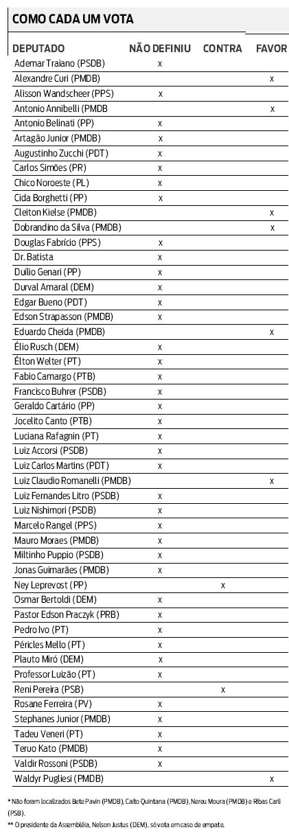 Dos 54 deputados estaduais, apenas seis todos da bancada do PMDB declararam ser favoráveis ao projeto. Dois são contra e a grande maioria 40 parlamentares não sabe ainda como votar e só vai tomar uma posição após as audiências públicas que começaram na sexta-feira em Cascavel e vão até o final do mês.