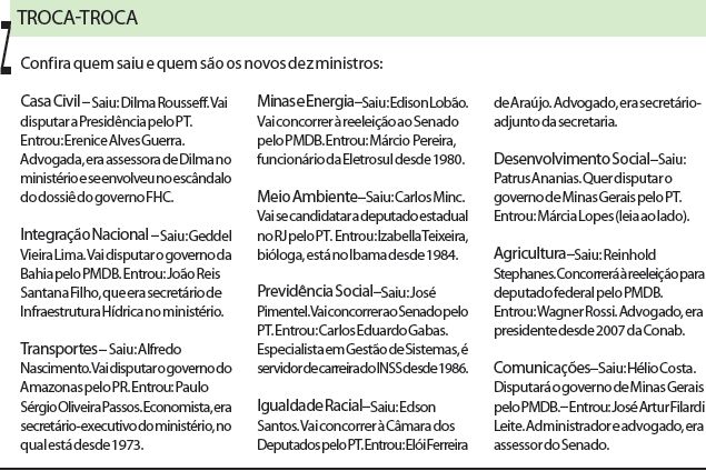 A cerimônia teve um tom emotivo e envolveu dois paranaenses. Reinhold Stephanes (PMDB) foi substituído pelo advogado Wagner Rossi no Ministério da Agricultura. O peemedebista volta à Câmara dos Deputados e concorrerá à reeleição. A londrinense Márcia Lopes assumiu o Ministério do Desenvolvimento Social no lugar de Patrus Ananias, que tenta ser candidato ao governo de Minas Gerais pelo PT. Ela havia sido secretária-executiva da pasta entre 2004 e 2007. Volta a Brasília por uma indicação pessoal de Lula.