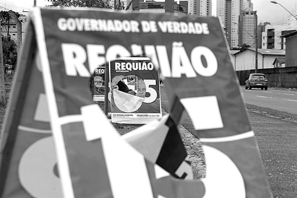 O ódio da população aos cavaletes dos candidatos rende cenas inusitadas como a registrada na foto: uma imensa sequência de cavaletes perfurados.