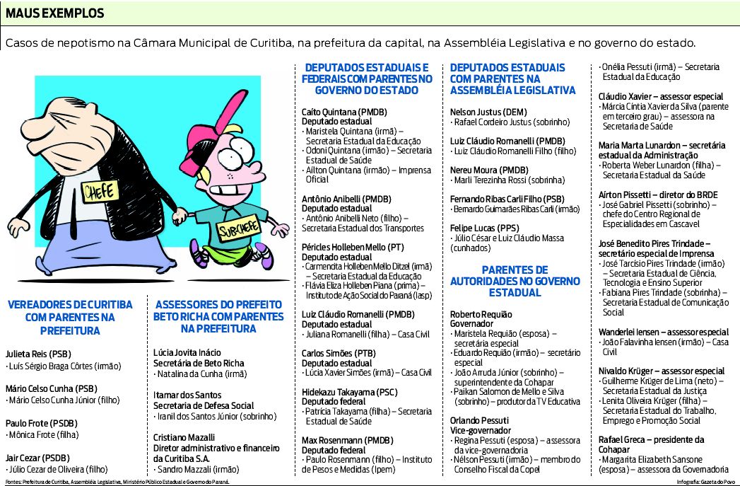 Um levantamento feito pela Gazeta do Povo, com informações do próprio governo do estado e dos demais poderes, revela que o emprego de parentes se proliferou nos órgãos públicos paranaenses. A imensa maioria dos políticos nega que tenha indicado o familiar para algum cargo.