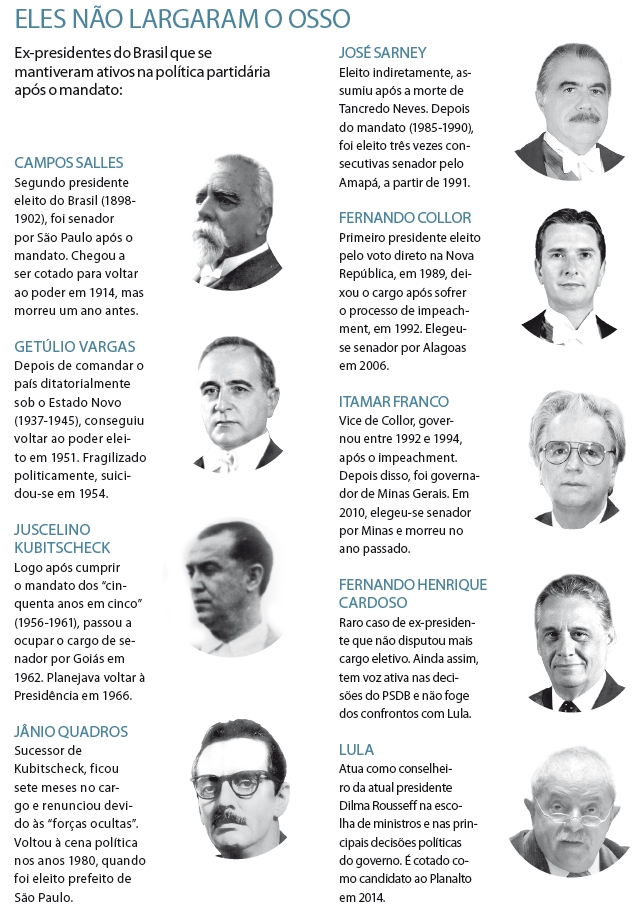 A cruzada de Lula contra o mensalão e as declarações de Fernando Collor sobre os 20 anos do impeachment reabrem a discussão sobre o papel dos ex-presidentes brasileiros. Desde os primórdios da República, a maioria dos governantes em períodos democráticos continuou com influência na rotina política e eleitoral do país. Dos seis nomes que passaram pelo Palácio do Planalto após a ditadura militar (1964-1985), quatro ocuparam posteriormente outros cargos eletivos.