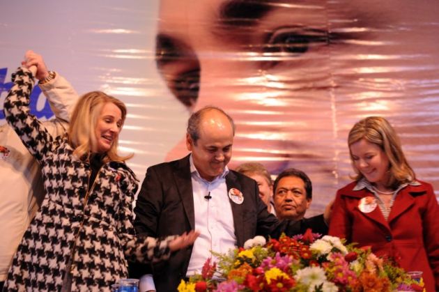 Na convenção de sábado do PDT, Gustavo Fruet viu-se no palanque cercado de mulheres: sua vice, Miriam Gonçalves (PT, na foto à esquerda); a irmã, Eleonora; a noiva, Márcia Oleskowski; a ministra Gleisi Hoffman (PT, à direita); a deputada Rosane Ferreira (PV) e a vereadora Professora Josete (PT). O candidato aproveitou para "tirar onda" de bem acompanhado: "Se pudesse escolher um slogan para minha campanha seria Bendito é o Fruet entre as mulheres."
