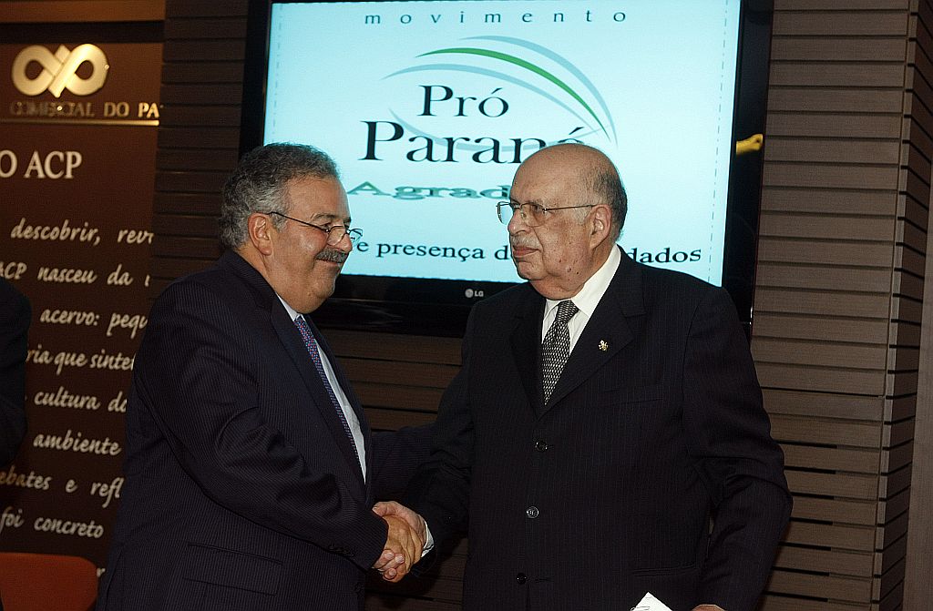 Jonel Chede (foto, à direita) tomou posse ontem como presidente do Movimento Pró-Paraná para o biênio 2009-2011. Entre as bandeiras defendidas por Chede estão a luta para que o Paraná receba royalties da exploração de petróleo na camada do pré-sal e a duplicação integral da BR-116 até São Paulo. Na foto, ele é cumprimentado por Belmiro Valverde, que deixa o cargo. Compõem a diretoria: Cleverson Marinho Teixeira (1º vice-presidente), Luís Renato Pedroso (2º vice-presidente), Fernando Fontana (3º vice-presidente), Guido Albano Guérios (4º vice-presidente e 1º secretário), José Eduardo de Moraes Sarmento (5º vice-presidente e 2º secretário), Domingos Tarço Ramalho (6º vice-presidente e 1º tesoureiro), Jackson Pitombo Filho (7º vice-presidente e 2º tesoureiro) e Wilson Portes (8º vice-presidente).