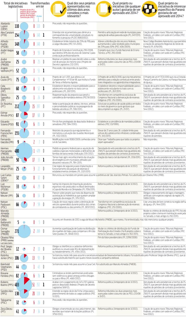 Durante a semana passada, a Gazeta do Povo procurou todos os 30 deputados federais do Paraná que estão no exercício do mandato para perguntar quais dos seus projetos consideram mais relevantes (veja quadro). Das propostas citadas, poucas estão perto de ser aprovadas. A situação é parecida entre os parlamentares de outros estados. Em 2011 e 2012, dos 54 projetos de lei aprovados pela Câmara, 36 foram de autoria do Executivo ou Judiciário, 15 vieram do Senado e apenas 3 foram assinados por deputados.