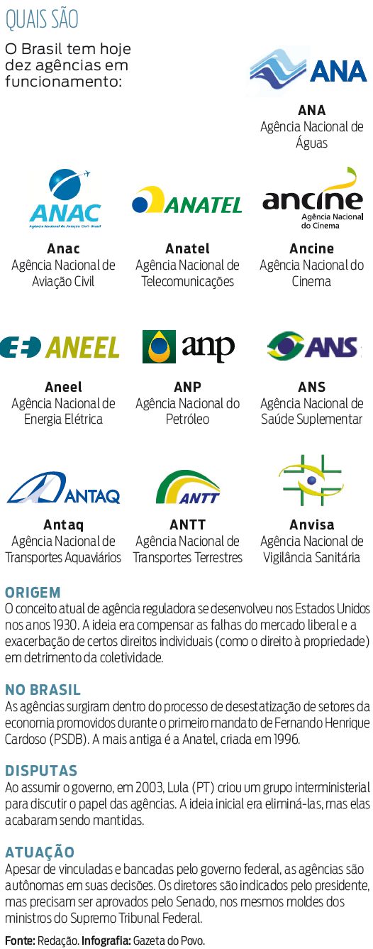 As agências reguladoras surgiram no Brasil a partir de 1996, segundo ano do primeiro mandato do ex-presidente Fernando Henrique Cardoso (PSDB). Elas eram parte do processo de desestatização de áreas como telecomunicações, energia elétrica, transportes e aviação civil. Foram concebidas como instituições de atuação independente com o papel de equilibrar e fiscalizar as relações entre novos entes privados responsáveis por esses serviços, os consumidores e o Estado.