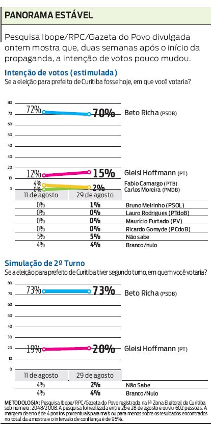 A pesquisa de intenções de voto Ibope/RPC/Gazeta do Povo divulgada ontem mostra que a maior parte dos curitibanos acredita na reeleição do prefeito Beto Richa (PSDB), independentemente do candidato em que pretende votar. O Ibope mostra que 70% da população votaria em Richa se a eleição fosse hoje (na pesquisa estimulada) e que 90% dos curitibanos acreditam que o atual prefeito irá vencer as eleições. Somente 4% dos entrevistados aposta na vitória da segunda candidata na pesquisa, Gleisi Hoffmann (PT), que obteve 16% das intenções de voto. Na pesquisa anterior do Ibope, 81% dos entrevistados achavam que o prefeito seria reeleito.