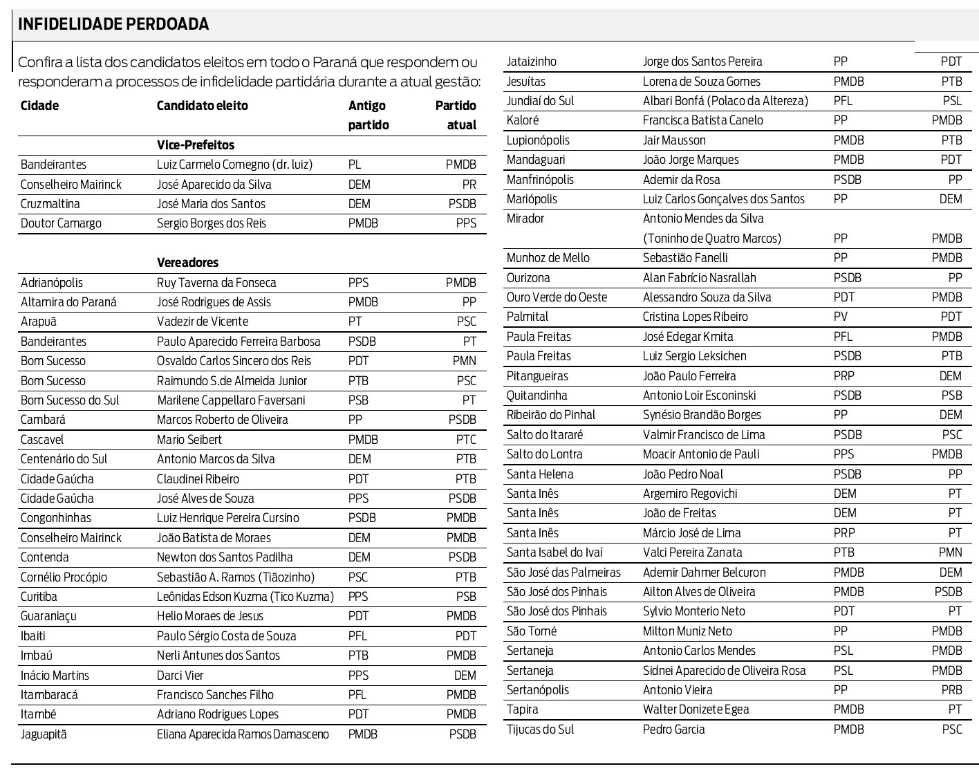 Os eleitores paranaenses que votaram nas últimas eleições colocaram de volta nas Câmaras municipais 58 políticos cassados neste ano por infidelidade partidária. Dois foram os vereadores mais votados em suas cidades. Outros quatro infiéis se elegeram vice-prefeitos. Desde que entrou em vigor a determinação do Tribunal Superior Eleitoral (TSE) sobre a fidelidade partidária, em outubro de 2007, 165 vereadores perderam os cargos no Paraná.