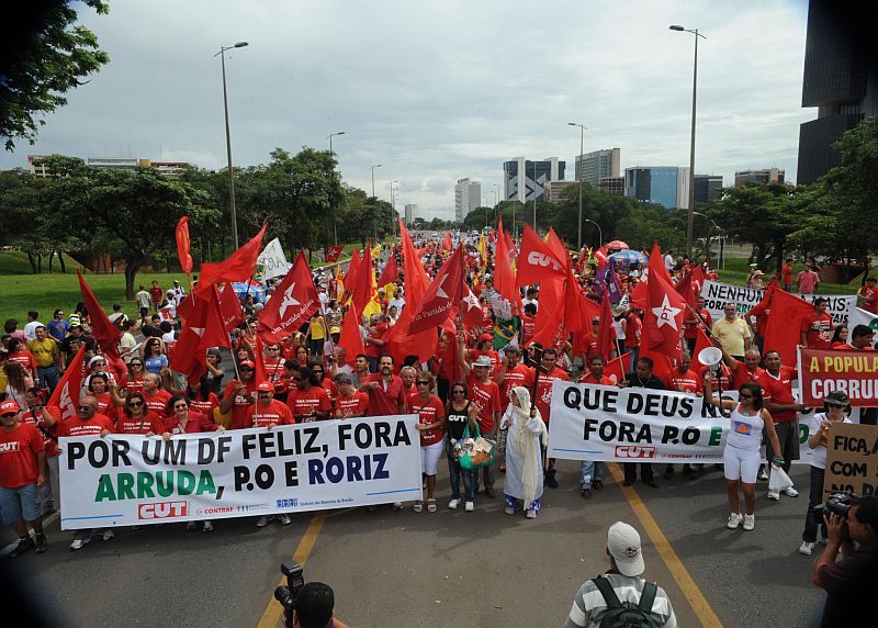 Centenas de pessoas ligadas à entidades sindicais e de estudantes, além de políticos da oposição saíram em passeata neste domingo (7) pelo Eixo Rodoviário Sul de Brasília. Os manifestantes pediam a saída do governador do Distrital Federal, José Roberto Arruda (sem partido).