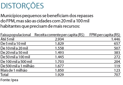 As distorções do FPM são graves: outra pesquisa que faz parte da publicação do Ipea mostrou que um município com 10.188 moradores recebe 33% a mais de repasses do fundo se ganhar um único morador a mais. Existem 120 municípios com pouco mais de 10.188 moradores, e não chega a 40 o número de cidades com população abaixo de 10.188. Além disso, 192 municípios dos 3.565 avaliados excediam a população esperada no início das faixas, afetando o destino de R$ 238 milhões do FPM.