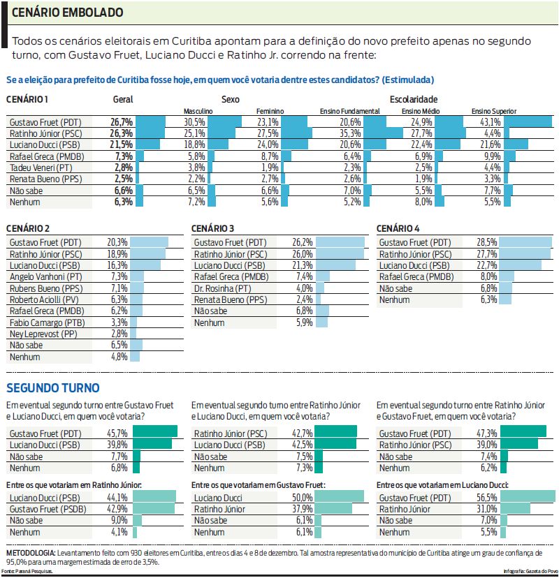 O ex-deputado federal Gustavo Fruet, que em setembro trocou o PSDB pelo PDT, aparece na frente em todos os quatro cenários pesquisados, com variação de 20,3% a 28,5% das intenções de voto. Mas está praticamente empatado com o deputado federal Ratinho Júnior (PSC), com índices variando de 18,9% a 27,7%. O prefeito Luciano Ducci (PSB) está em ligeira desvantagem em relação aos outros dois. Tem entre 16,3% e 22,7%. Mas, considerando a margem de erro da pesquisa (3,5 pontos porcentuais para mais ou para menos), os três estão tecnicamente empatados (veja os resultados ao lado).