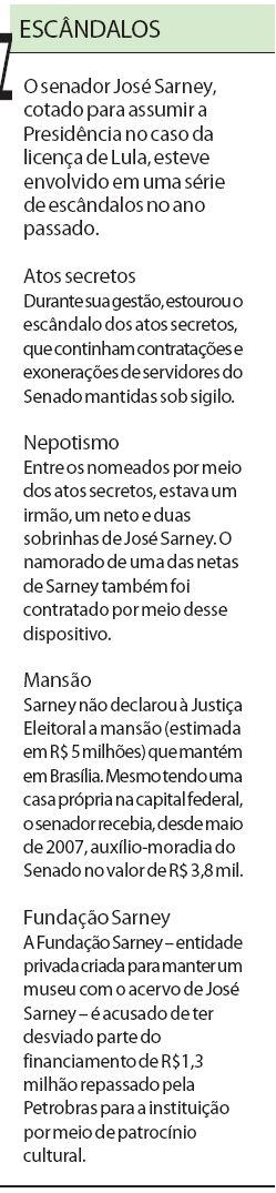 Uma pessoa próxima ao presidente reclamou da divulgação da notícia de que Lula se afastaria, pois, se isso ocorresse, quem assumiria o cargo seria Sarney, alvo de uma série de denúncias nos últimos meses (veja quadro). Os demais nomes da linha sucessória devem ser candidatos o vice-presidente José Alencar pode sair para o Senado e o presidente da Câmara, Michel Temer (PMDB-SP), disputa a indicação para vice na chapa de Dilma.