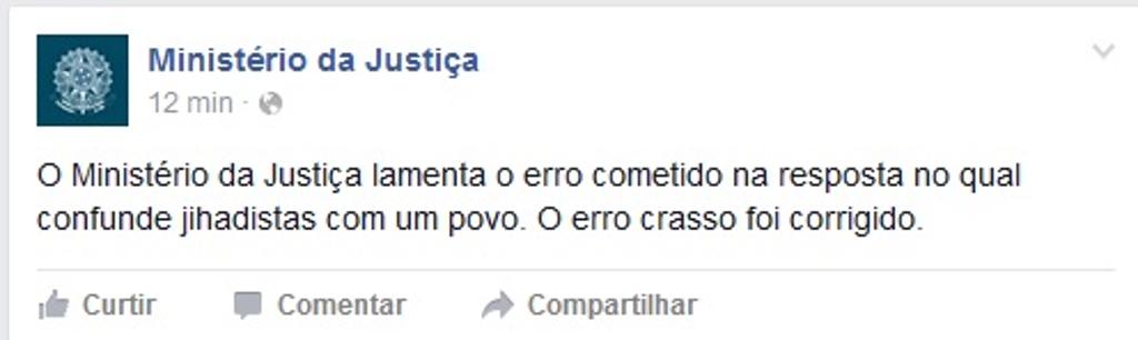 O Ministério da Justiça afirmou em resposta a um usuário do Facebook que jihadistas “merecem respeito”, pois podem trazer “progresso ao Brasil”, como “qualquer outro povo”.