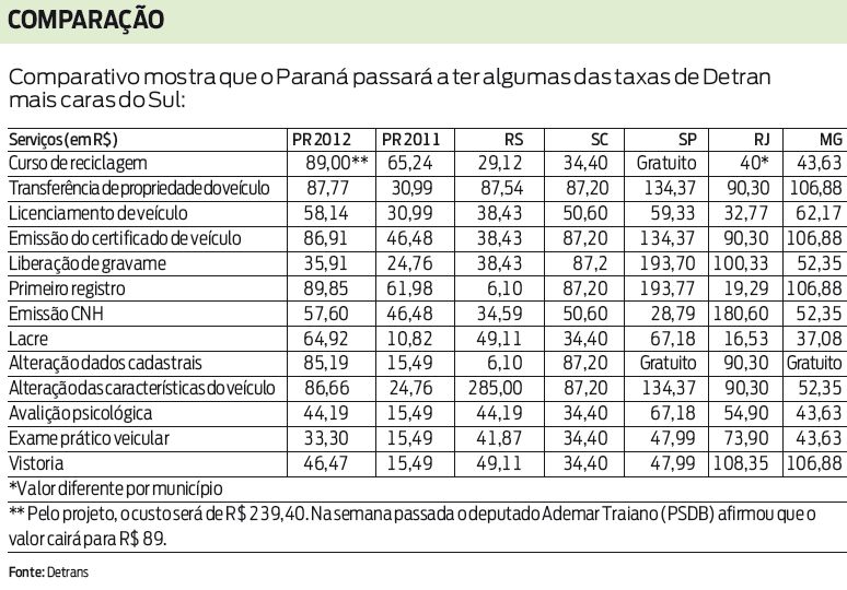 O projeto de lei que reajusta as taxas do Departamento Estadual de Trânsito do Paraná (Detran-PR) vai tornar algumas das tarifas cobradas dos paranaenses as mais caras do Sul do país. Levantamento feito pela Gazeta do Povo com 13 serviços muito procurados nos Detrans mostra que, ao menos em sete deles, as taxas do Paraná serão maiores do que as do Rio Grande do Sul e de Santa Catarina. Uma das taxas do Paraná a do curso de reciclagem vai ficar a mais cara do Sul e do Sudeste. O valor atual, de R$ 65,24, já era o maior cobrado para se fazer o curso nas duas regiões. Com o reajuste, vai para R$ 89,00.