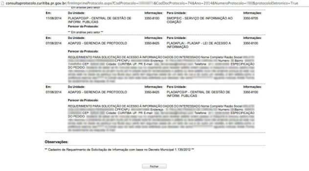 O Executivo possui um sistema unificado para diferentes tipos de cadastros; a regra é que apenas as informações sobre a tramitação do processo estejam públicas: se foi aprovado, encaminhado, se está em alguma secretaria. O chefe de protocolo não soube dizer quanto tempo o erro ficou no ar, segundo a assessoria de comunicação da prefeitura. A jornalista que verificou o bug relata que ele estava no ar desde janeiro deste ano, no site http://consultaprotocolo.curitiba.pr.gov.br/index.aspx.