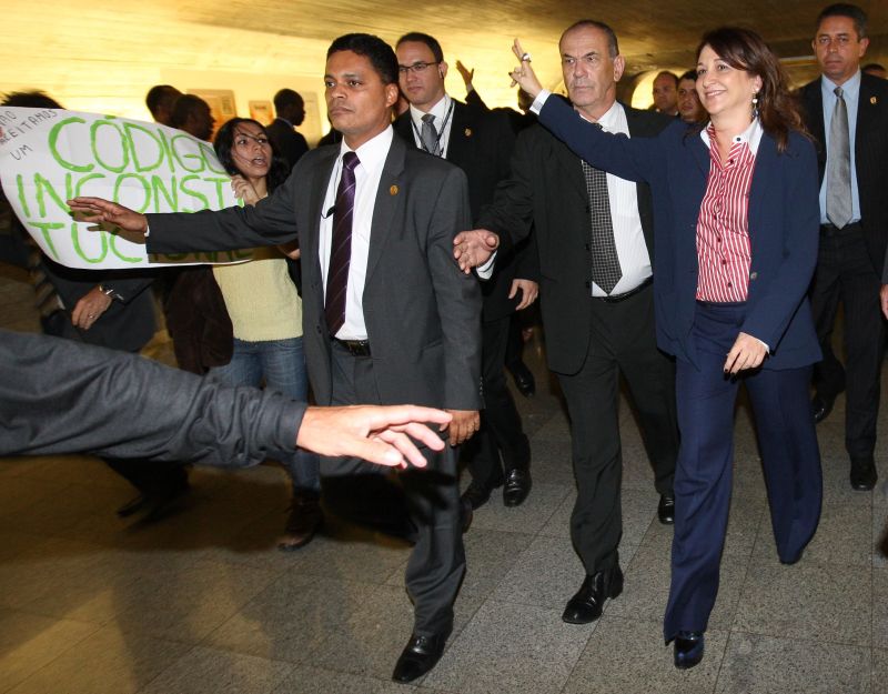 Presidente da Confederação Nacional da Agricultura (CNA), a senadora Kátia Abreu (PSD-TO) foi obrigada a deixar a sessão na qual votava o projeto do Código Florestal protegida pela Polícia do Senado. Ela se sentiu ameaçada por estudantes que estavam acampados no corredor em protesto contra o encaminhamento da proposta. Aos gritos de "Kátia Abreu não compra eu" e de "Senado vergonha nacional", os estudantes acompanharam a senadora, rodeada por policiais, até o plenário por onde ela deixou a Casa. Dos 20 destaques apresentados ao relatório do senador Luiz Henrique da Silveira (PMDB-SC), apenas um foi aprovado. Outros dois foram rejeitados e os demais foram retirados da pauta por acordo.