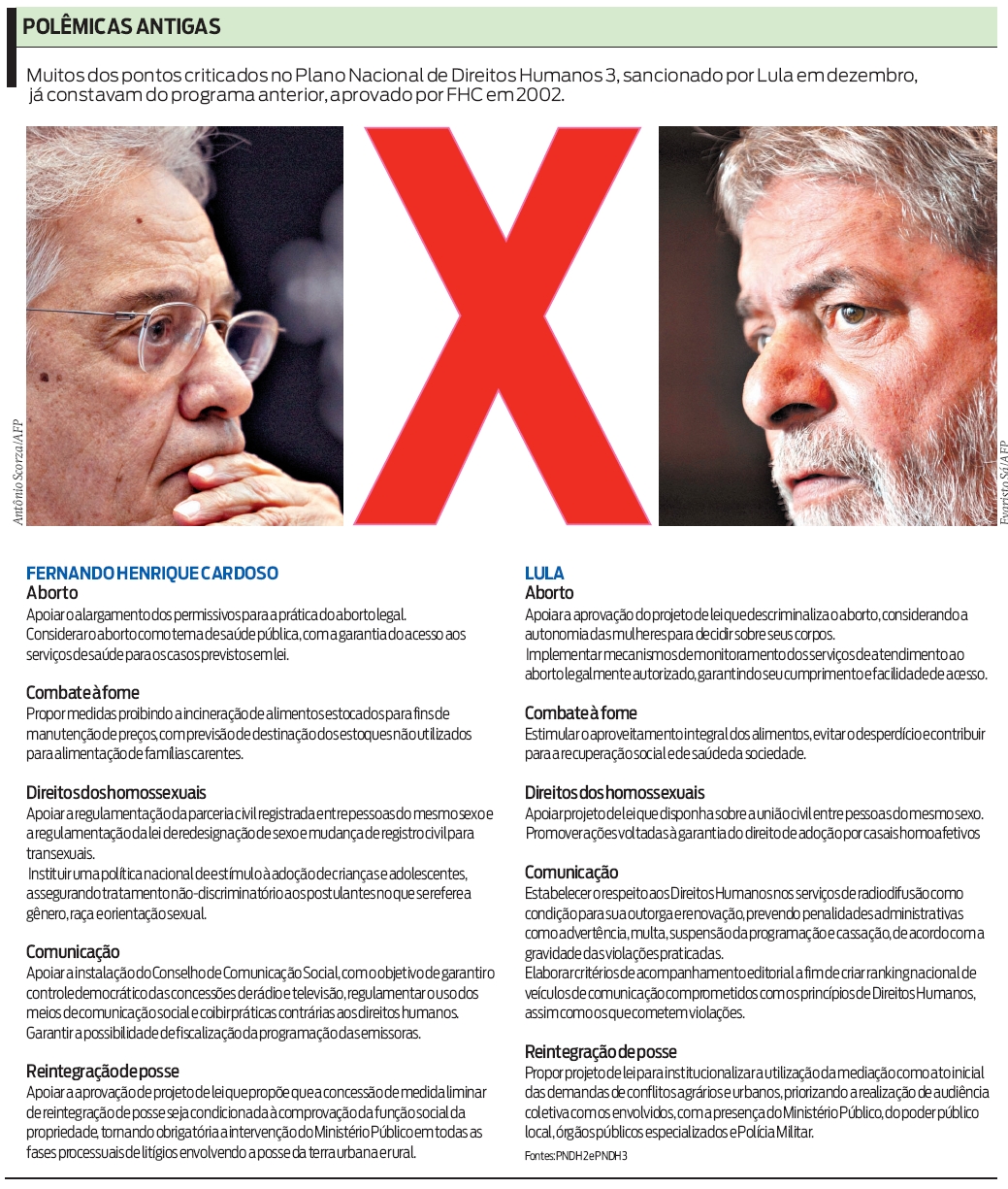 Os pontos mais polêmicos do Plano Nacional de Direitos Humanos (PNDH) 3, apresentado pelo presidente Luiz Inácio Lula da Silva em dezembro passado, já constavam do PNDH 2, que foi proposto em 2002, sob a chancela do então presidente Fernando Henrique Cardoso. A descriminalização do aborto, a união de pessoas do mesmo sexo e mecanismos de controle dos meios de comunicação são alguns dos itens em comum nos dois projetos. Entre os assuntos espinhosos, a única novidade é a apuração e esclarecimento das ações praticadas durante a ditadura militar (1964-1985).