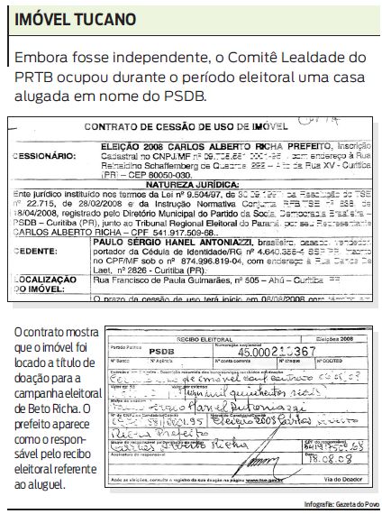 Embora os coordenadores da campanha de reeleição do prefeito Beto Richa aleguem que o comitê de apoio formado por dissidentes do PRTB era independente, a casa ocupada pelo grupo durante o período eleitoral do ano passado estava alugada em nome do PSDB. No recibo eleitoral referente ao contrato de aluguel, ao qual a Gazeta do Povo teve acesso, Richa aparece como o responsável pela locação do imóvel, embora a assinatura no documento não seja reconhecida como a dele. A reportagem, porém, verificou o número do recibo na prestação de contas de Beto na Justiça Eleitoral e o documento confere com o aluguel do imóvel.
