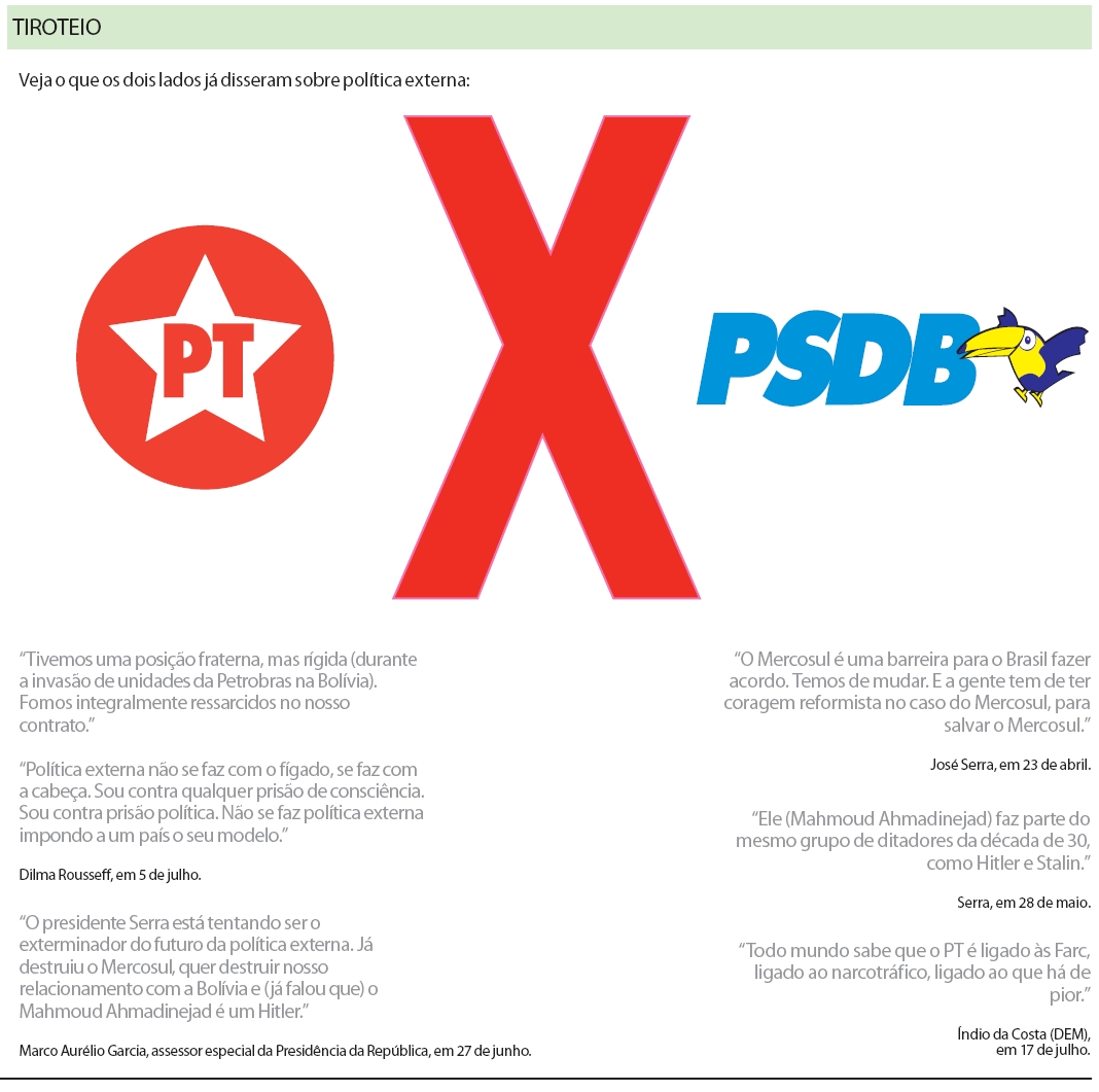 Do outro lado, as diretrizes para o programa de governo de Dilma aprovadas pelo congresso do PT, em fevereiro, destacam a "pequenez" dos tucanos. "Devíamos (no governo Fernando Henrique) nos conformar a um papel secundário na cena global, a não pretender sermos maiores do que somos", diz o documento.
