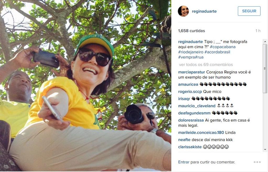 Regina Duarte marcou presença na manifestação de Copacabana deste domingo (16). A atriz subiu em uma árvore para tirar uma selfie mostrando a multidão e convocou seus seguidores para o ato, com a hashtag “vem pra rua”.