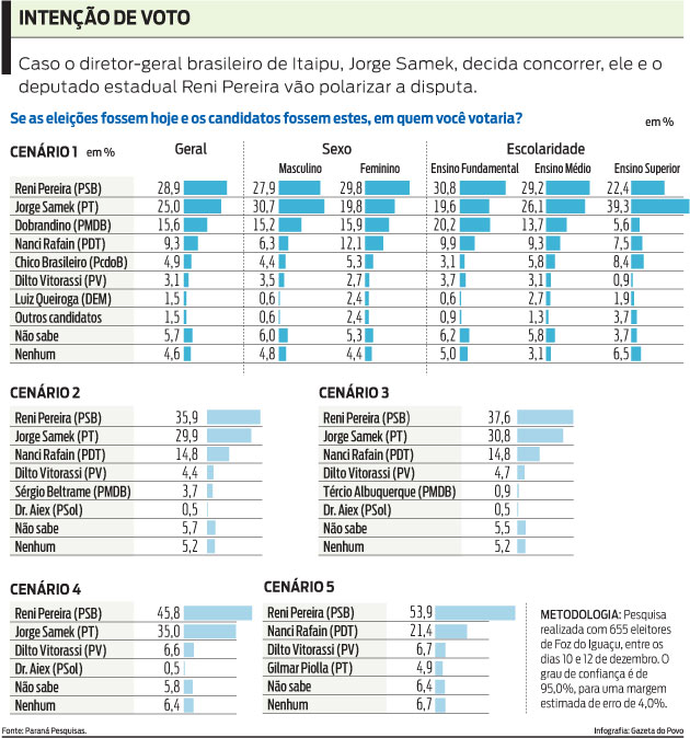 Levantamento feito pelo Instituto Paraná Pesquisas, exclusivo para a Gazeta do Povo, aponta uma disputa equilibrada entre Reni Pereira (PSB) e Jorge Samek (PT) na eleição de 2012 em Foz do Iguaçu. Se for considerada a margem de erro, os dois estão empatados tecnicamente em três de cinco cenários pesquisados. As intenções de voto em Reni variam entre 28,9% e 37,6%, enquanto Samek oscila entre 25% e 30,8%.
