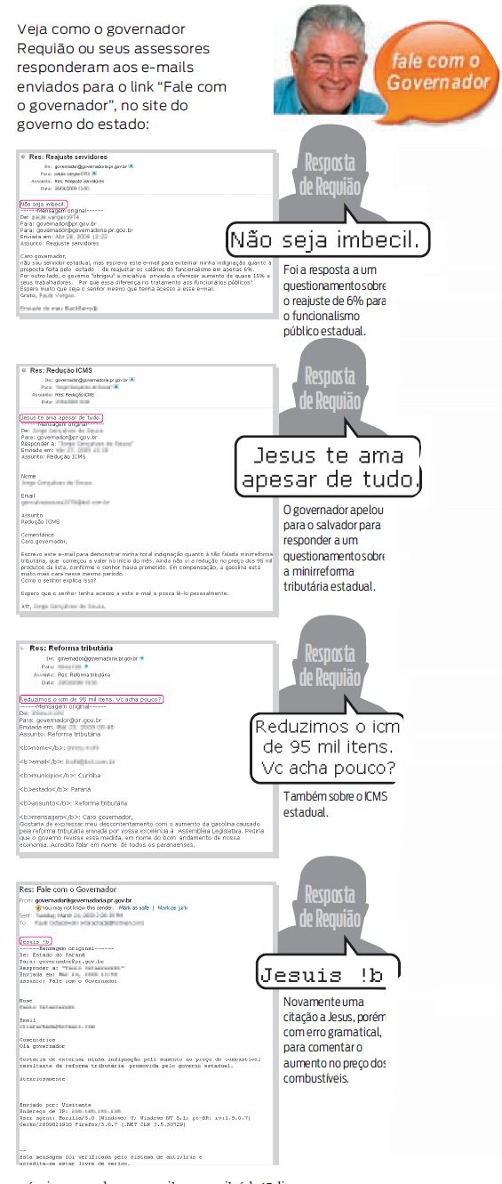 No fim de março, um leitor entrou em contato com a Gazeta do Povo para contar que havia recebido uma resposta grosseira do governo estadual após ter encaminhado uma crítica por meio do link "Fale com o Governador". Na mensagem endereçada a Requião, o cidadão que prefere não ser identificado questionava alguns pontos da minirreforma tributária implantada recentemente pelo governo. Menos de uma hora depois do envio do e-mail, veio a resposta com uma ofensa.